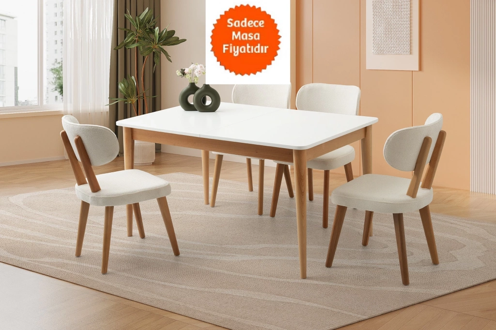 Ortadan Açılır Büyüyen Yemek Masası Beyaz-Naturel Ayaklı 90x140cm