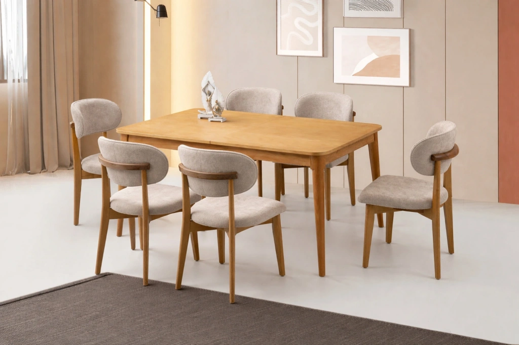 Takım, Ahşap ayaklı 1 adet Ahşap Masa ve 6 adet Ahşap Sandalye den oluşmaktadır.