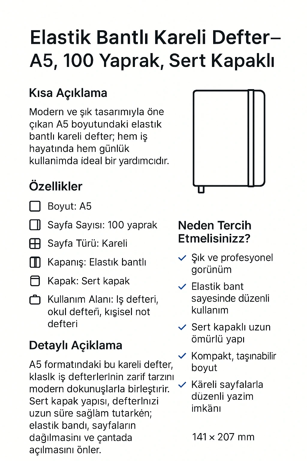 ELASTİK BANTLI KARELİ DEFTER Ürün İçeriği: Sert Kapaklı, Elastik Bantlı Kareli Defter. Kapak Yapısı: Sert Karton Sayfa Yapısı: Kareli Defter Boyut: A5 Kapasite:100 Yaprak.ÖLÇÜ : En:14.1cm x Boy:20,7cm