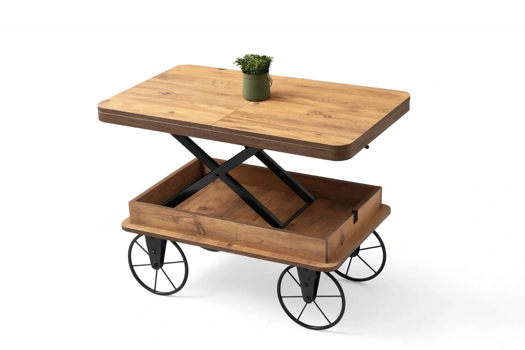 3 Kademe açılır yükselip açılabilen, 3 kademede de büyüyüp küçülebilen, çizilmez yonga lam malzeme kullanılmıştır. Kapalıyken sehpa orta yükseklikte çalışma masası veya notebook kullanımına uygun yükseklikte olup koltukta oturma yüksekliği olduğu için oturduğunuz yerden yemeğinizi rahatça yiyebileceğiniz bir yükseklik sağlamaktadır. Tam açılır yüksekliğinde normal standartlarda bir masa yüksekliğine yükselip sandalye veya ekstra tabureyle kullanıma uygundur. Estetik tasarımı sayesinde diğer fonksiyonel sehpalardan farklı duruşuyla başarılı bir tasarımdır.Farklı renk seçenekleriyle evinizdeki mobilya ve koltuklara uyum sağlayabilir özelliktedir. Sıvıya dayanıklı yonga lam malzeme kullanılmıştır. Bu özelliğinden dolayı sıcak ve soğuk malzeme konulduğunda renkte ve üründe bozulma olmamaktadır.