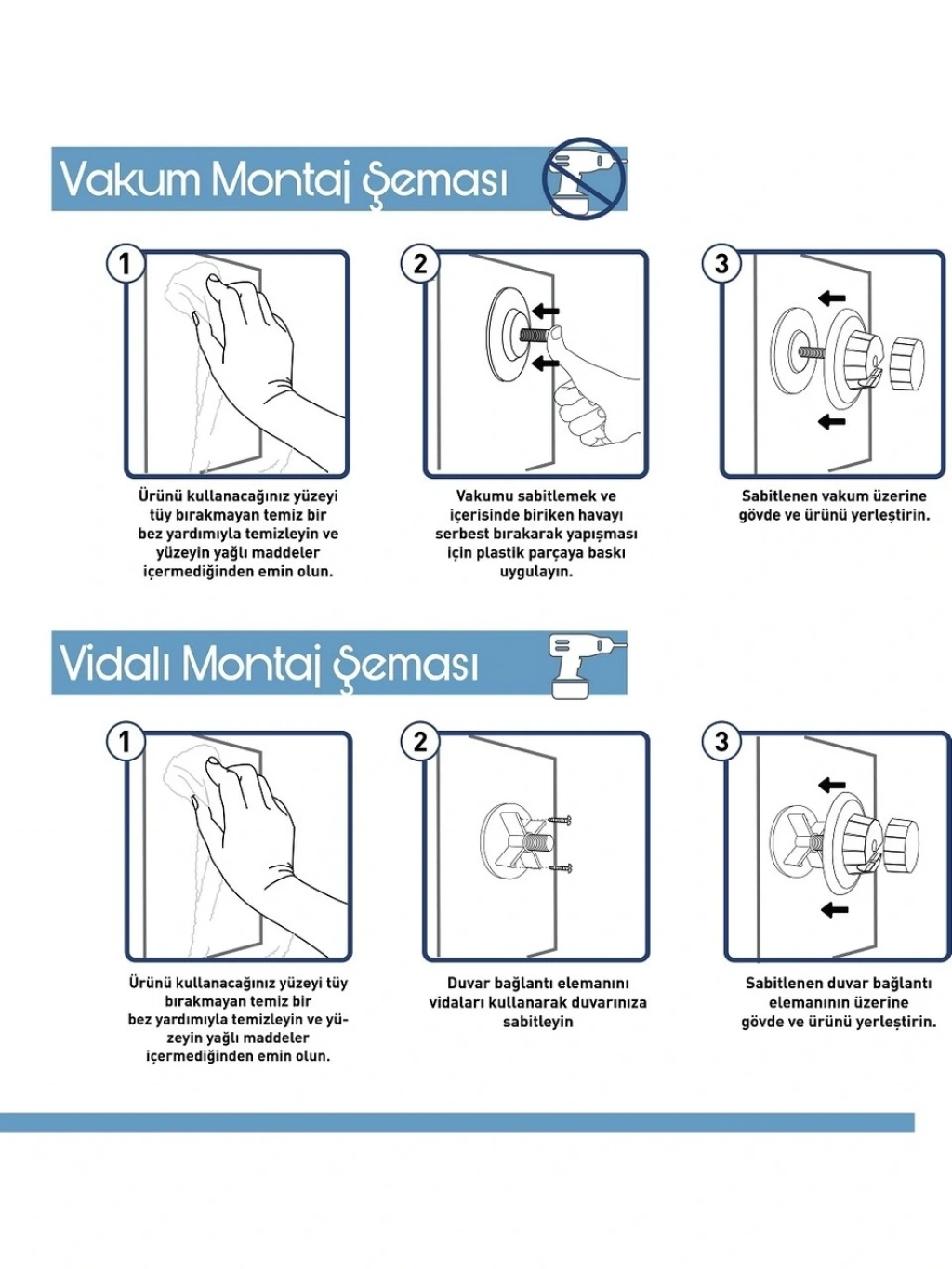 Kare Havluluk hem Vakum (Vantuz) ile hem de Vida ile duvara sabitlenmektedir, montaj tercihi size bırakılmıştır.