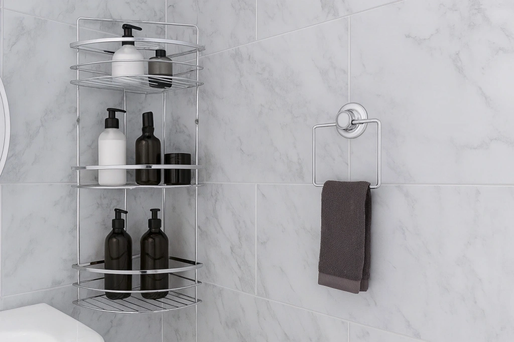 3 Katlı Banyo Köşe Rafı Vida ile duvara sabitlenmektedir,