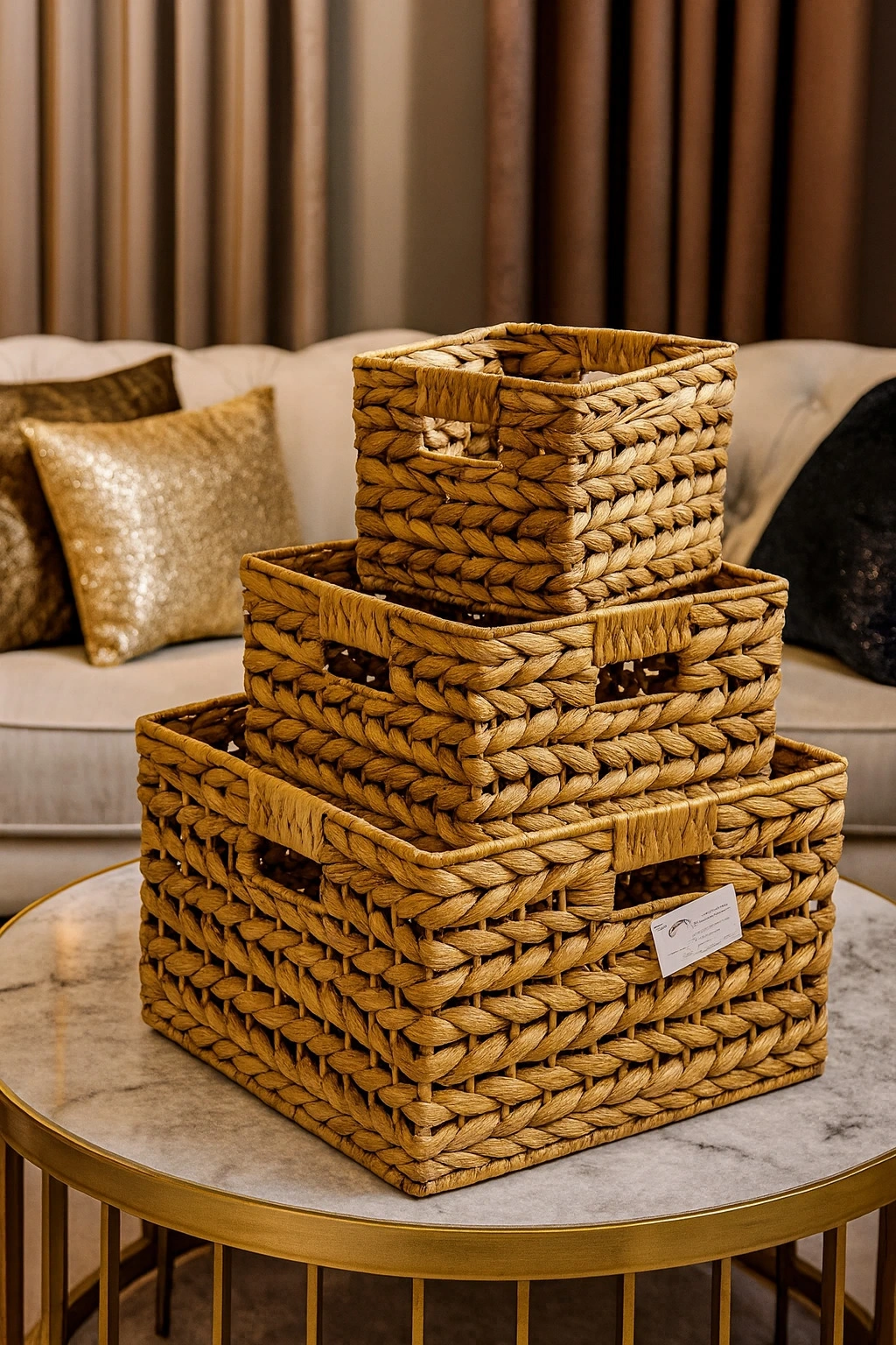 Dekoratif Kare Örgü Hasır Sepet Sele 3lü