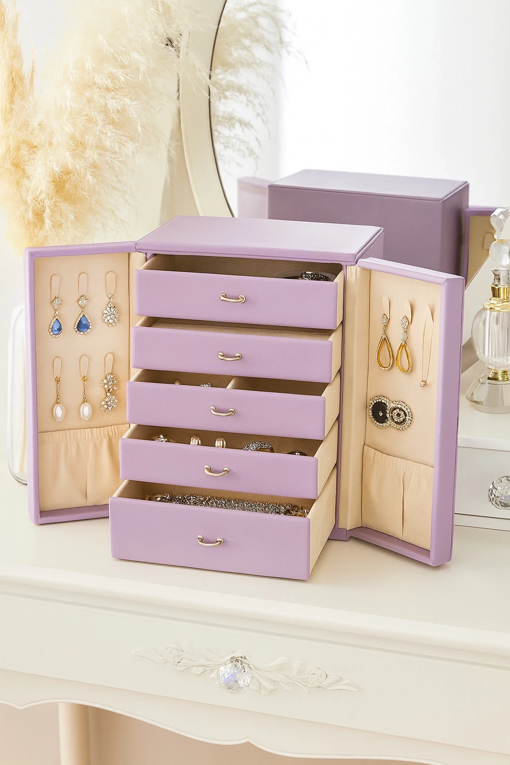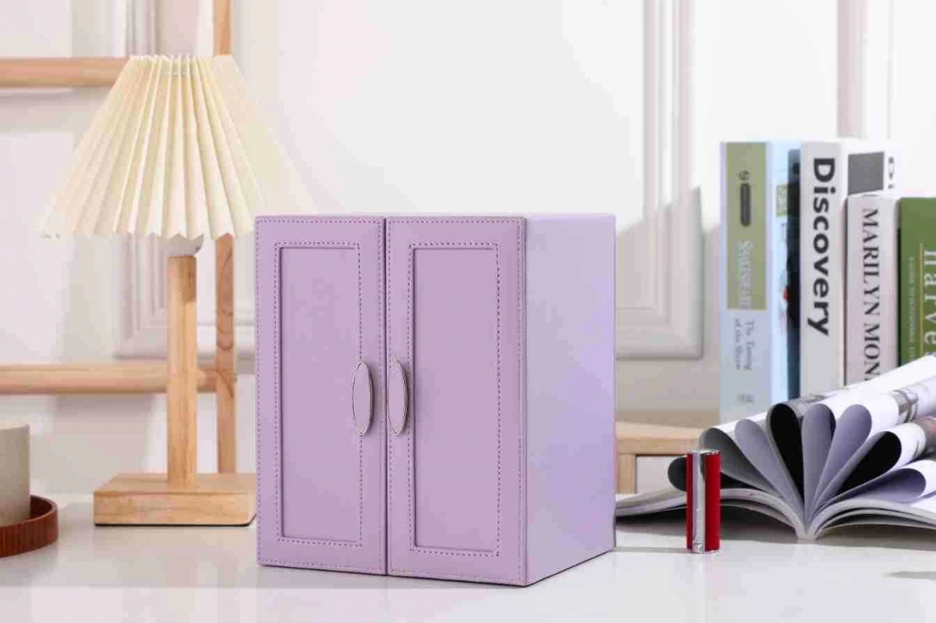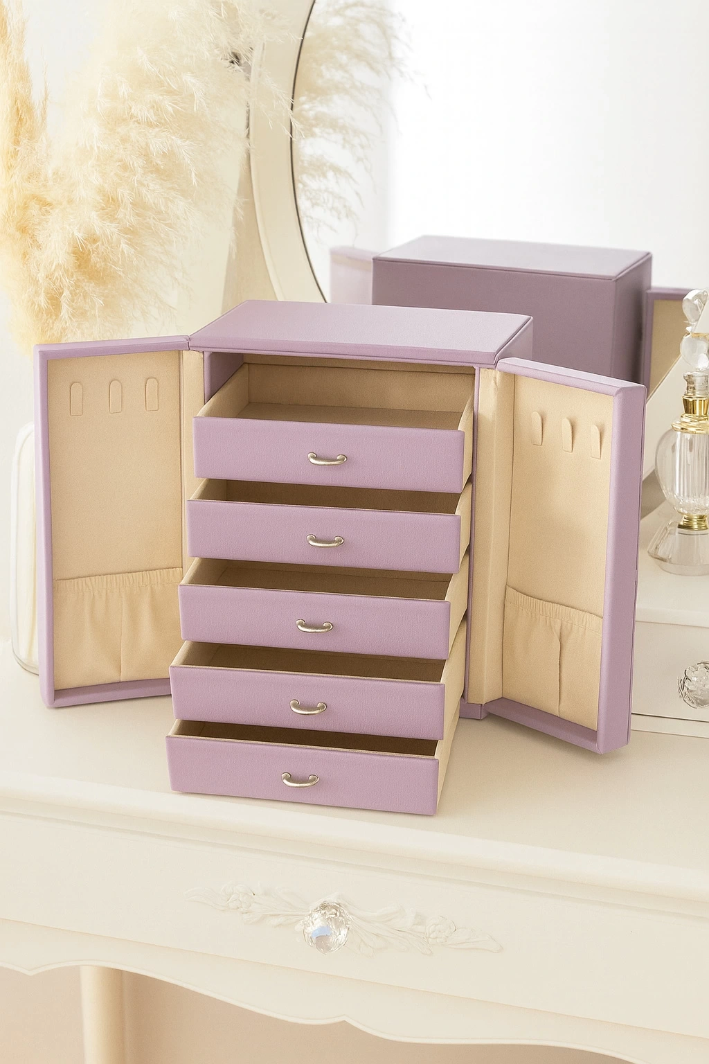 Dışı Deri İçi Kadife 5 Çekmeceli Takı Bijuteri Mücevher Kutusu Organizer Düzenleyici Lila İthal Ürün
