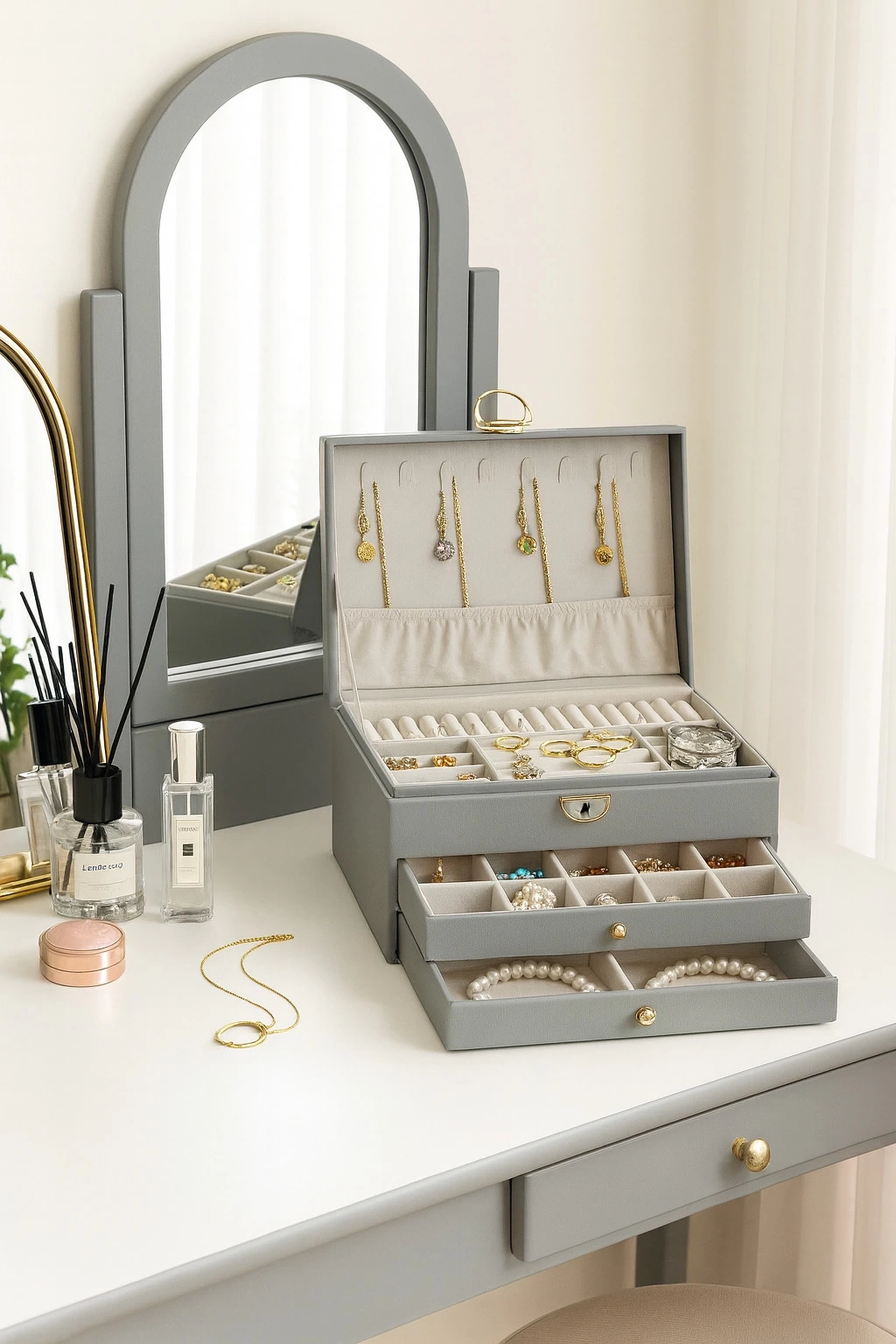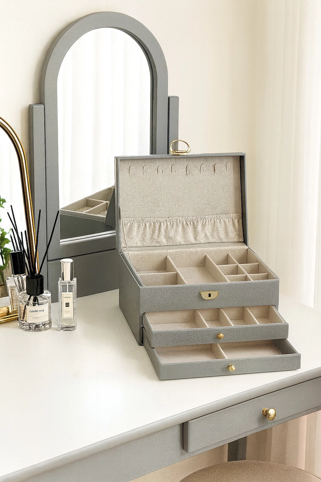 Dışı Deri İçi Kadife Kilitli 2 Çekmeceli Takı Bijuteri Mücevher Kutusu Organizer Düzenleyici Gri İthal Ürün