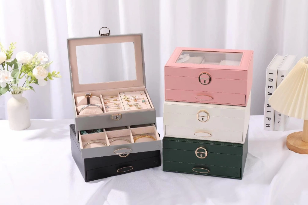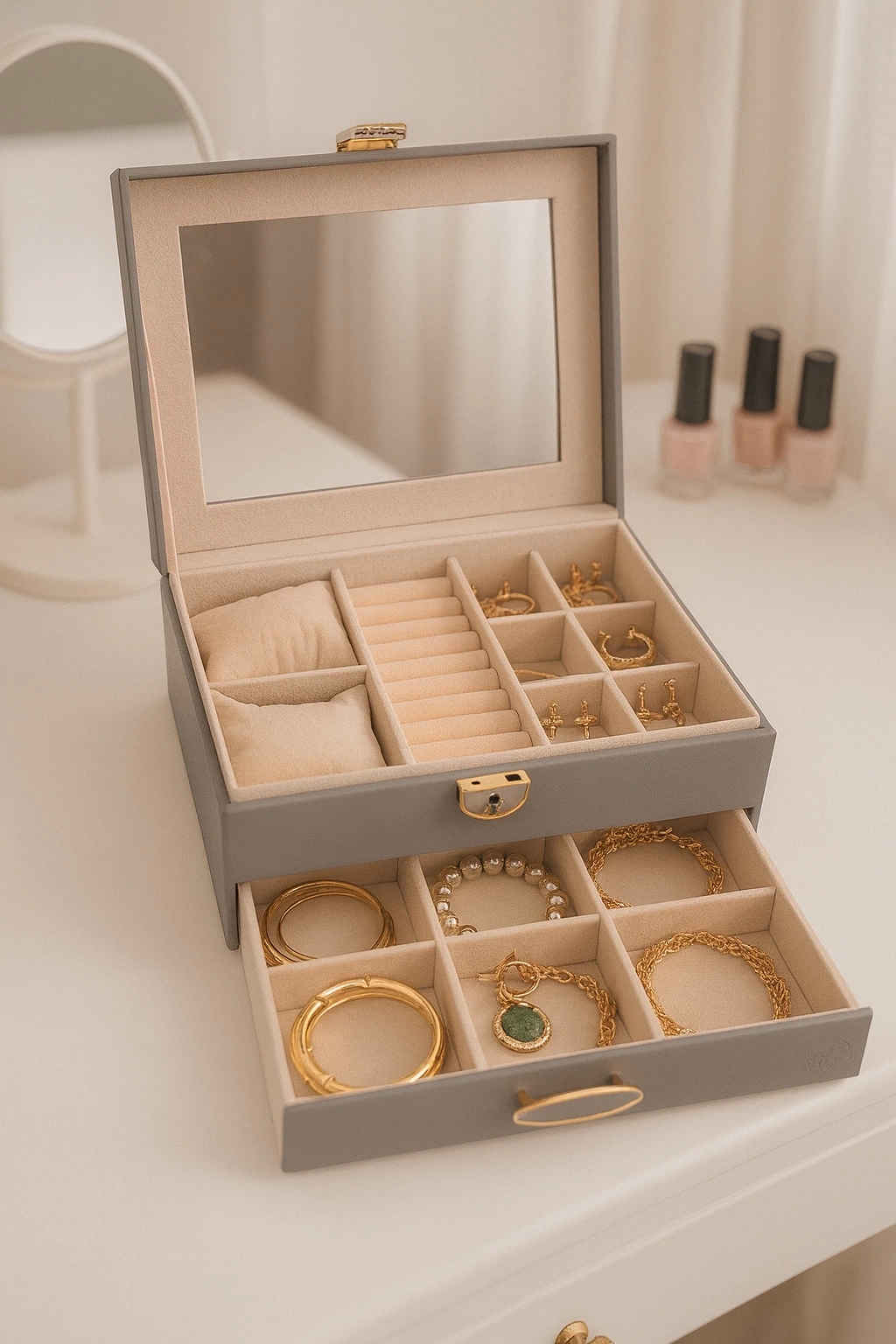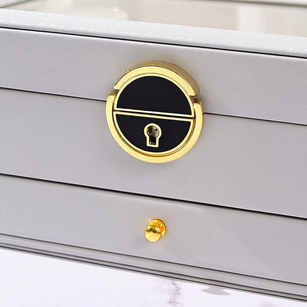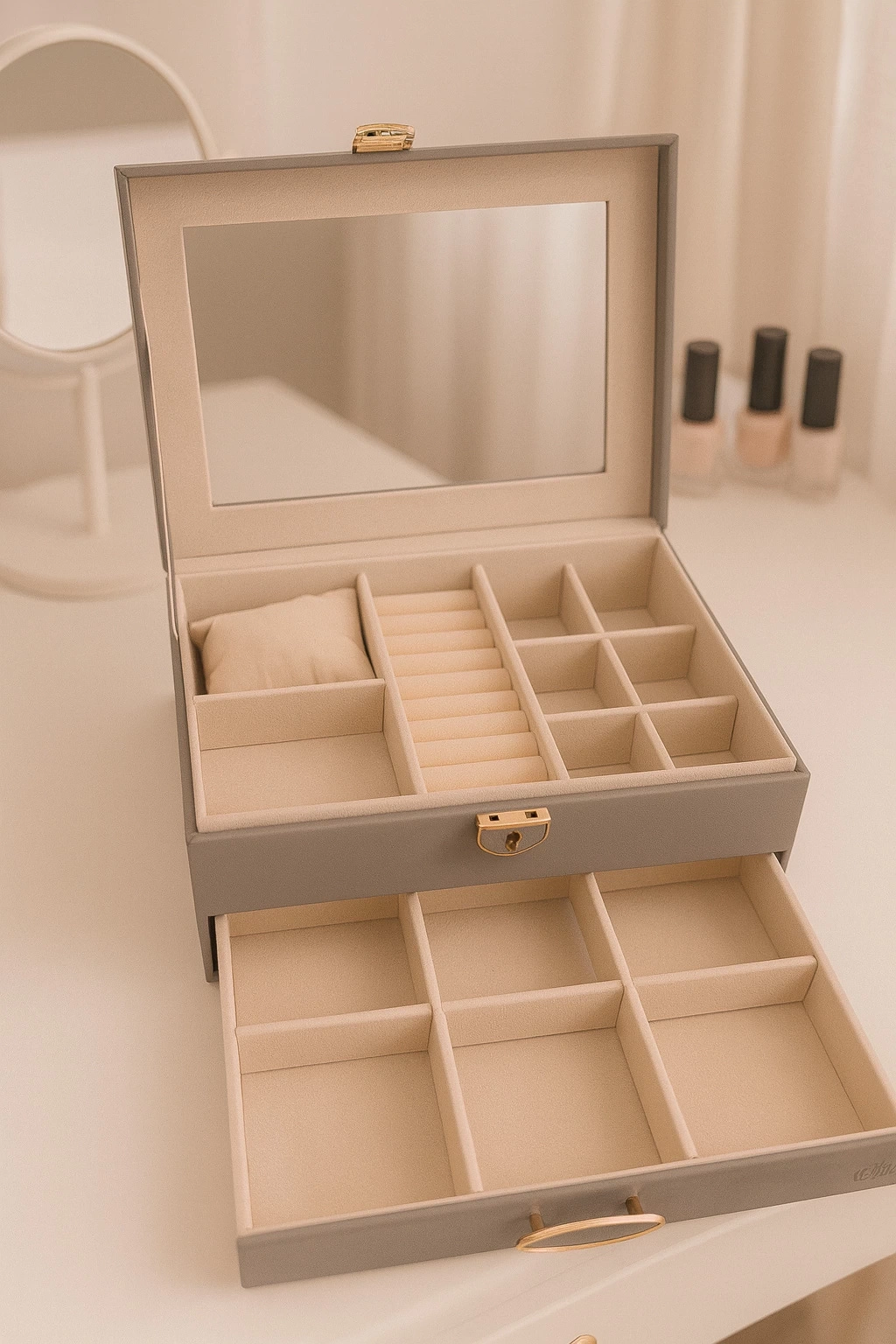 Dışı Deri İçi Kadife Kilitli 2 Çekmeceli Takı Bijuteri Mücevher Kutusu Organizer Düzenleyici